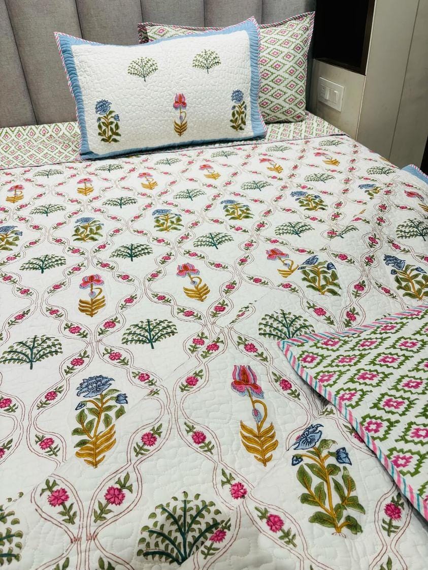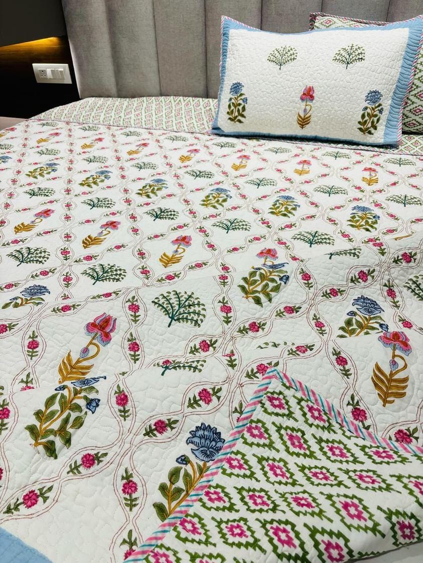 Floral Print Hand Block Quilted Bedcover King size 90*108